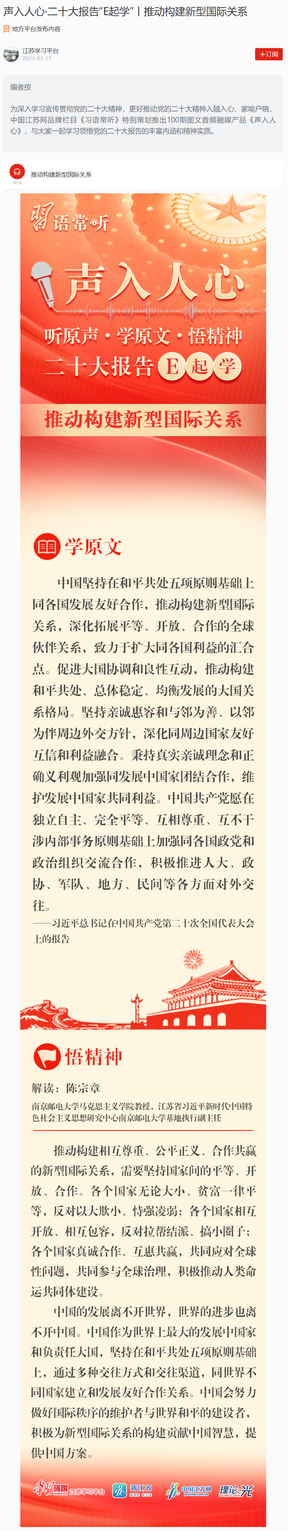 【学习强国】声入人心·二十大报告“E起学”丨推动构建新型国际关系