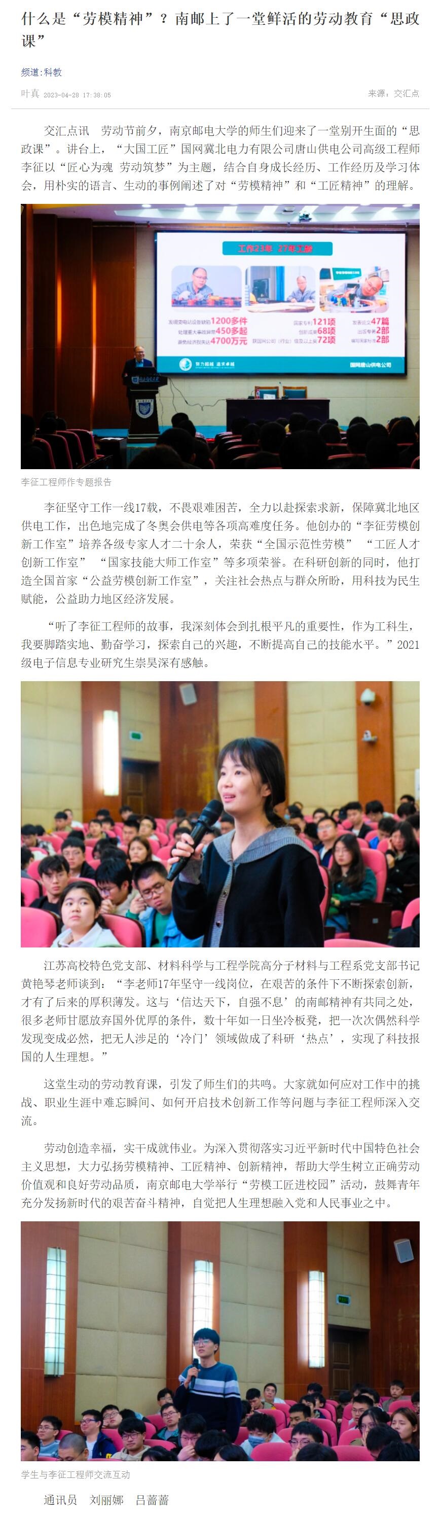 【新华日报客户端】什么是“劳模精神”?南邮上了一堂鲜活的劳动教育“思政课”