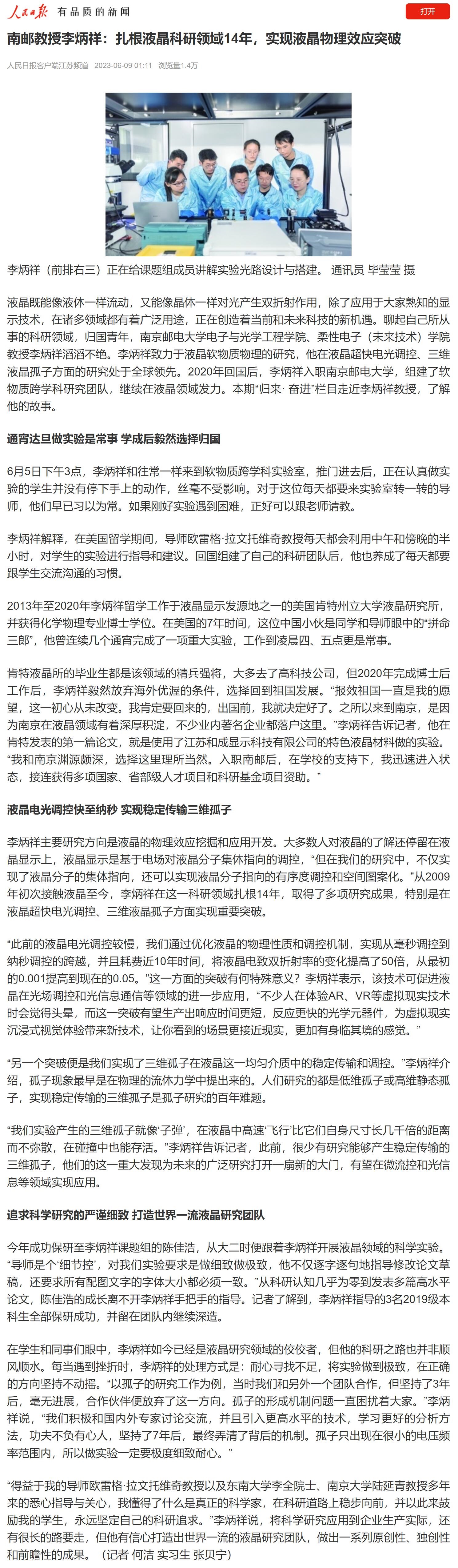 【人民日报客户端】南邮教授李炳祥:扎根液晶科研领域14年,实现液晶物理效应突破