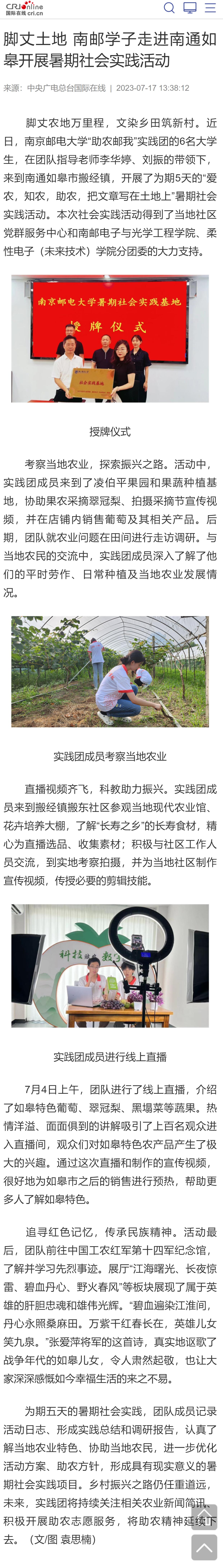 【中央广电总台国际在线】脚丈土地 南邮学子走进南通如皋开展暑期社会实践活动