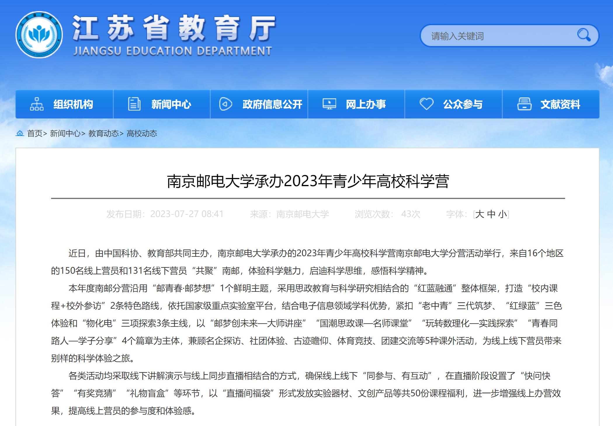 【省教育厅官网】南京邮电大学承办2023年青少年高校科学营
