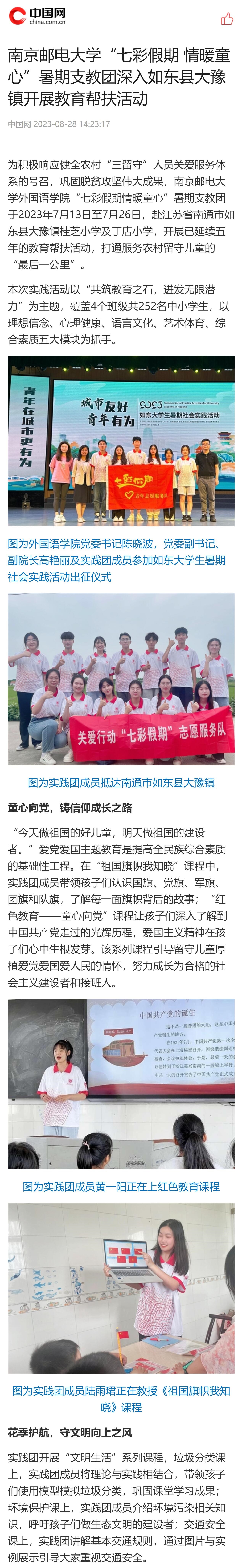 【中国网】南京邮电大学“七彩假期 情暖童心”暑期支教团深入如东县大豫镇开展教育帮扶活动