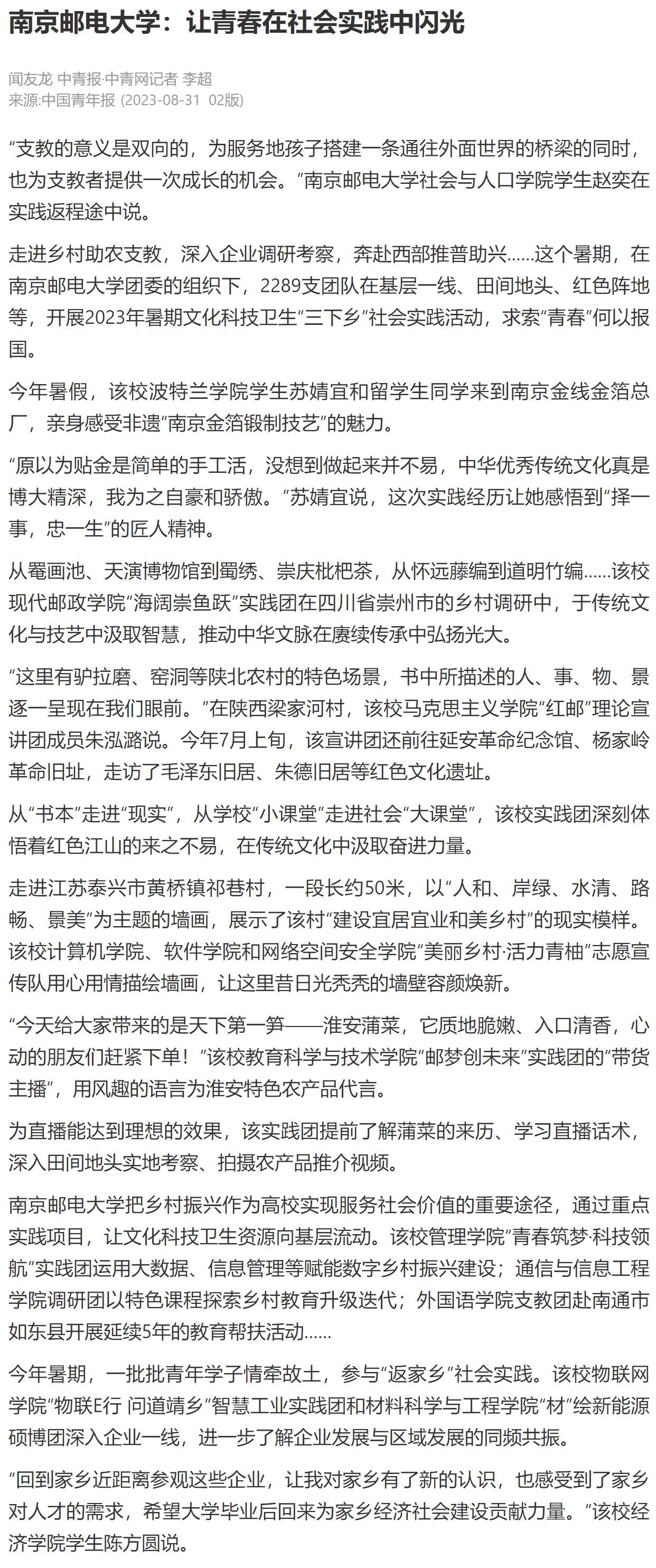 【中国青年报】南京邮电大学:让青春在社会实践中闪光