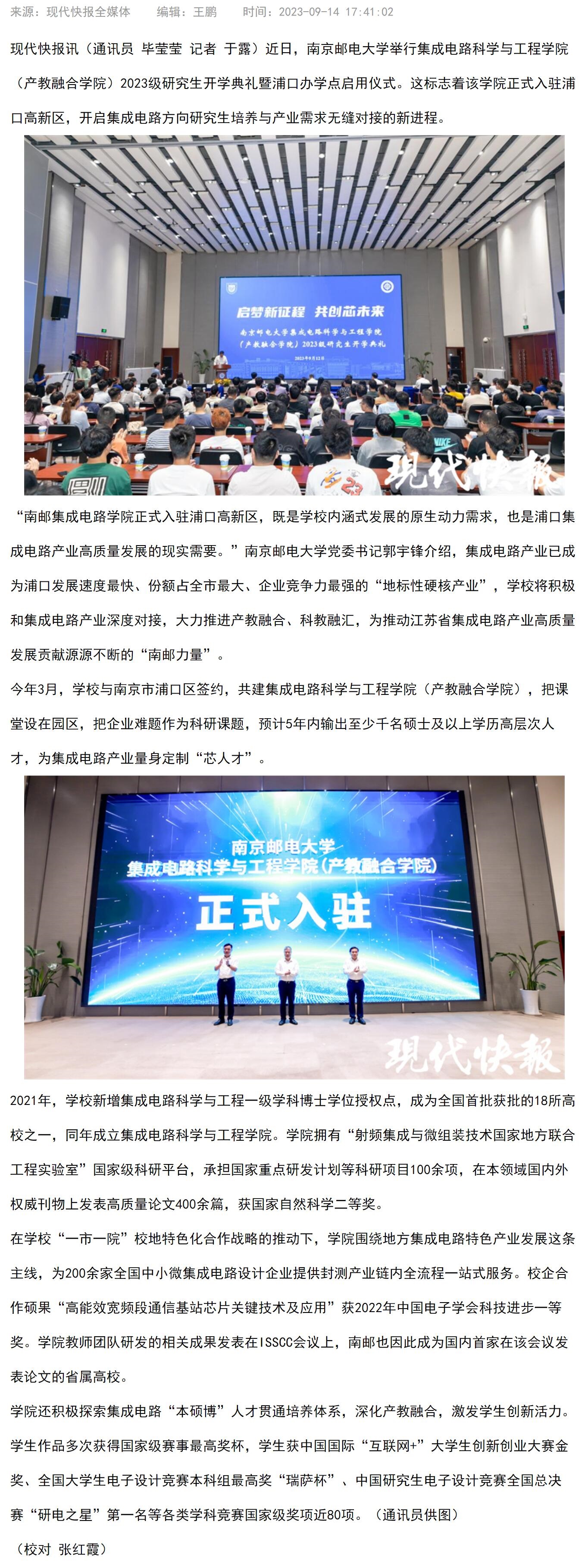 【现代快报全媒体】量身定制“芯人才”!南邮集成电路学院正式入驻浦口
