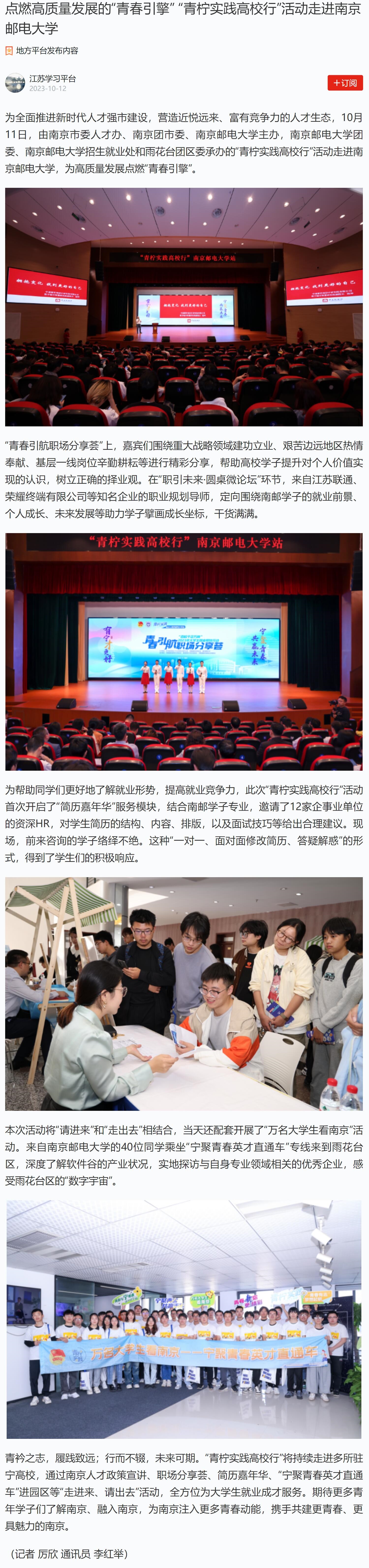 【学习强国】点燃高质量发展的“青春引擎” “青柠实践高校行”活动走进南京邮电大学