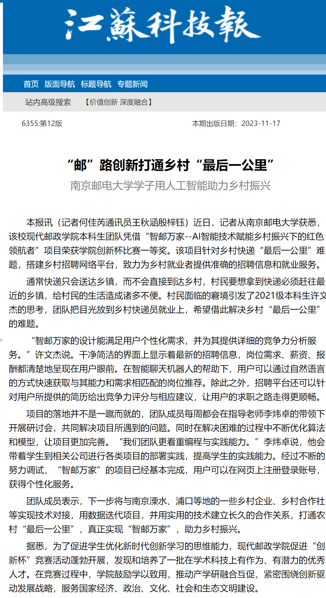 【江苏科技报】“邮”路创新打通乡村“最后一公里”