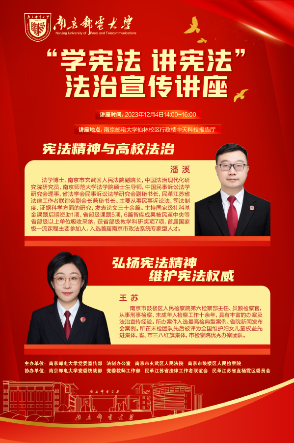 在国家宪法日来临之际,我校邀请南京市玄武区人民法院、南京市鼓楼区人民检察院来校开展“12.4”国家宪法日活动暨“学宪法讲宪法”法治宣传讲座,欢迎我校广大师生积极参加。