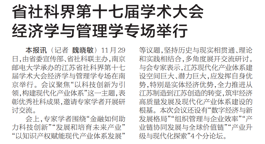 【新华日报】省社科界第十七届学术大会经济学与管理学专场举行