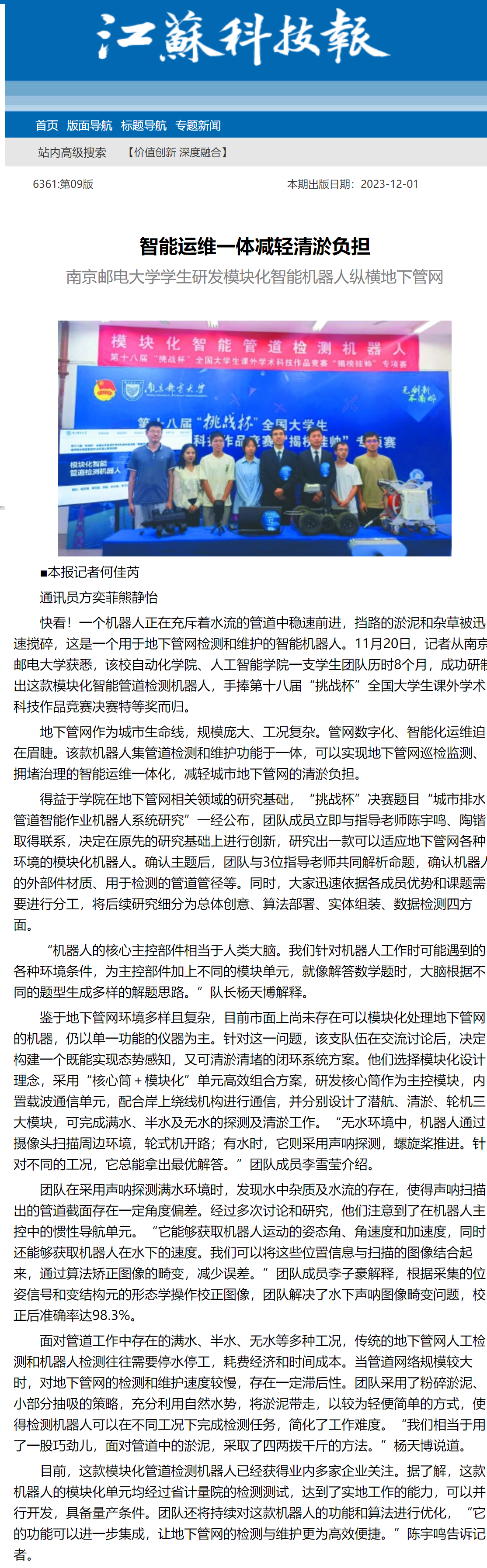 【江苏科技报】智能运维一体减轻清淤负担南京邮电大学学生研发模块化智能机器人纵横地下管网
