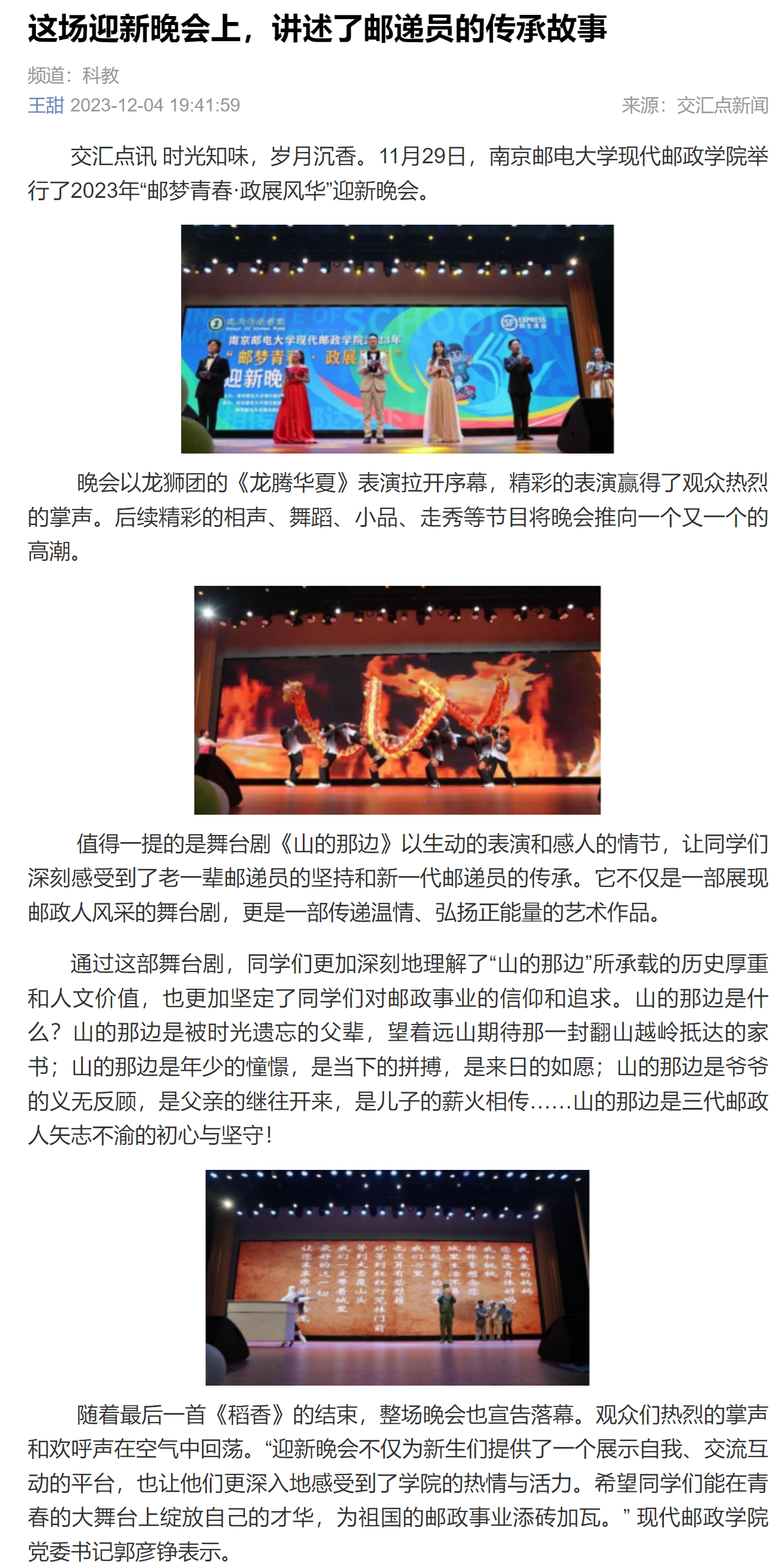 【新华日报客户端】这场迎新晚会上,讲述了邮递员的传承故事