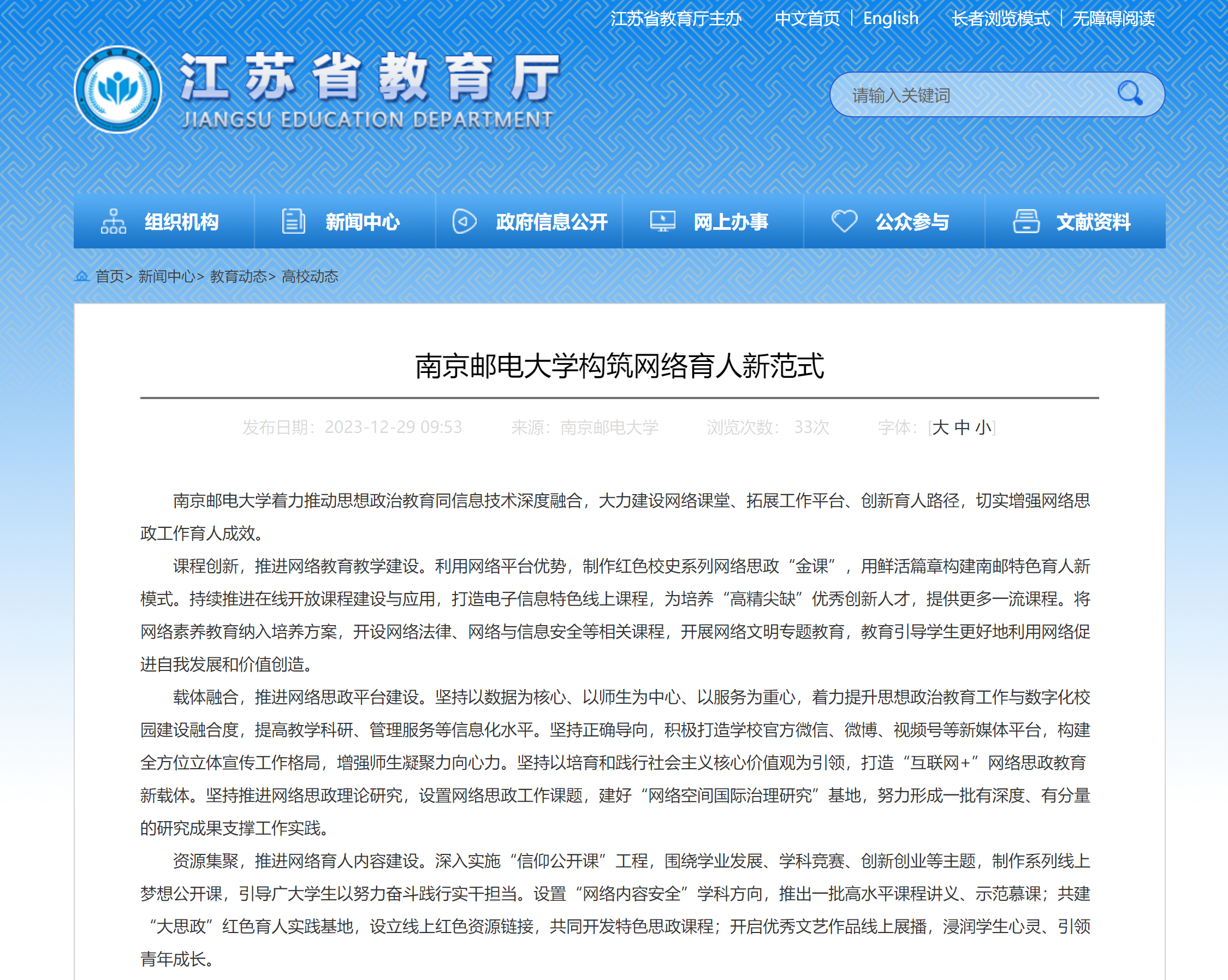 【省教育厅官网】南京邮电大学构筑网络育人新范式