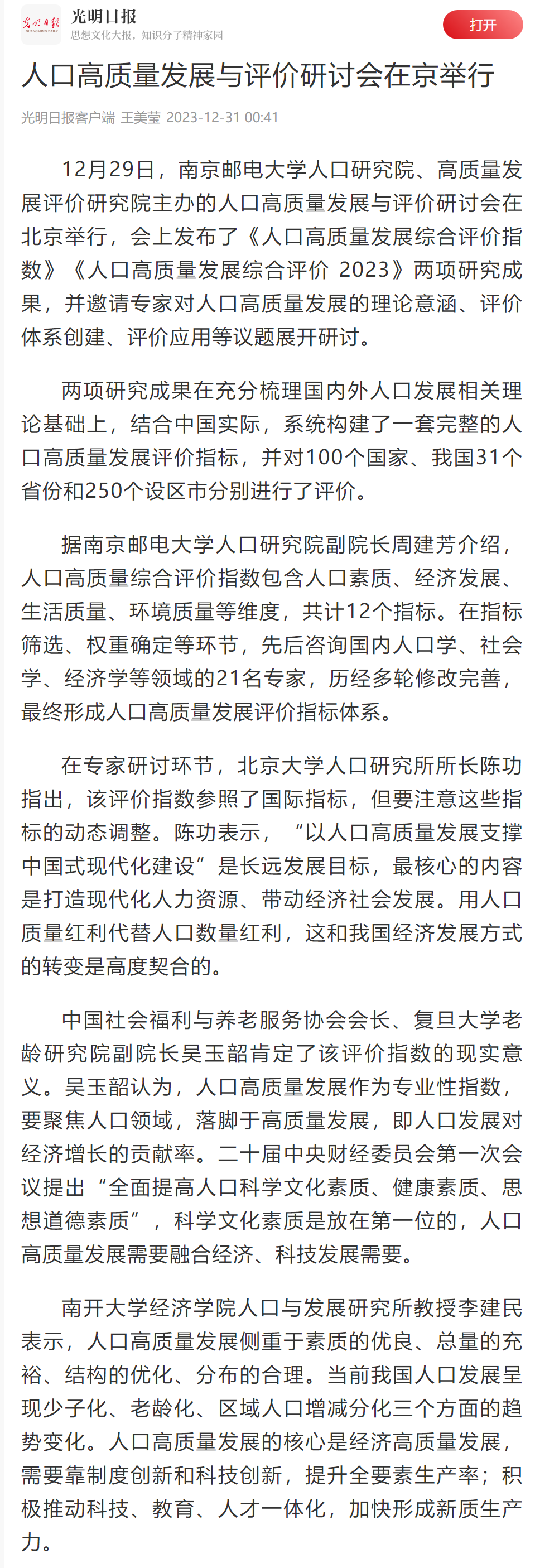 【光明日报客户端】人口高质量发展与评价研讨会在京举行