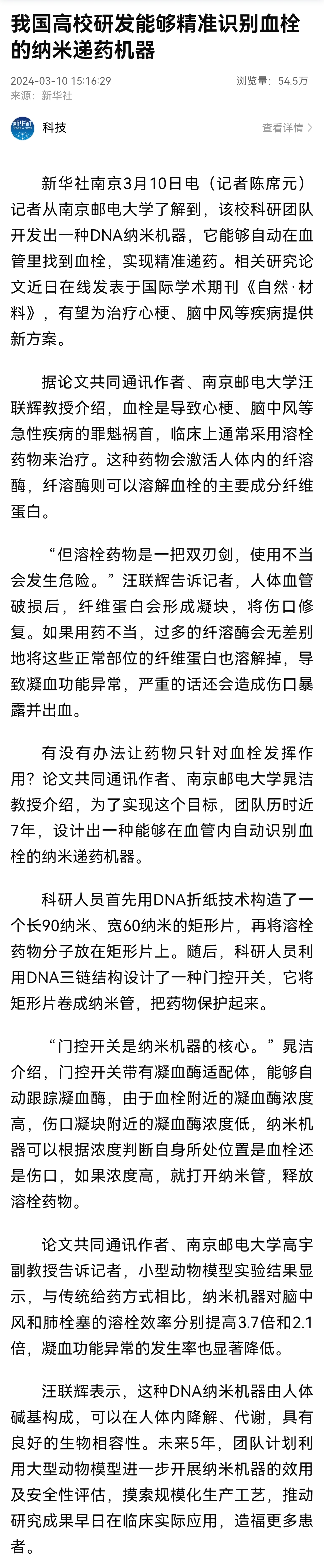 【新华社客户端】我国高校研发能够精准识别血栓的纳米递药机器