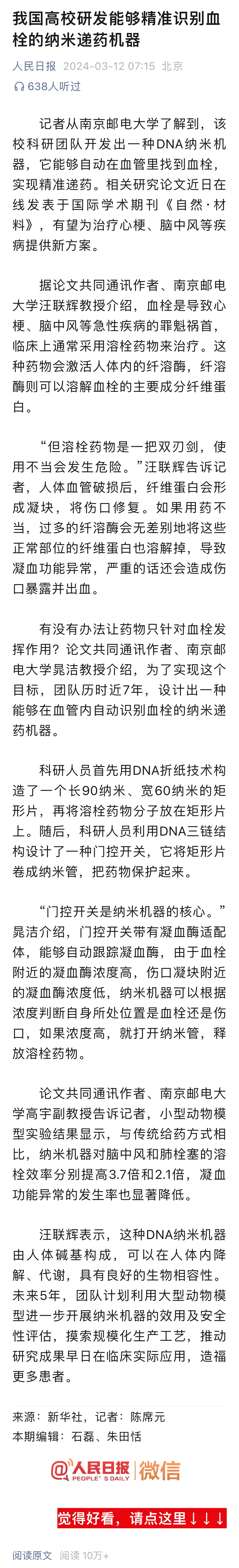 【人民日报微信客户端】我国高校研发能够精准识别血栓的纳米递药机器