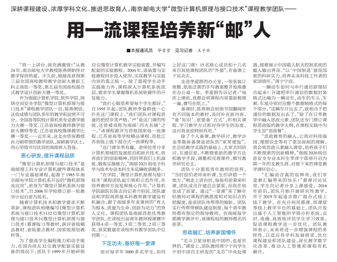 【江苏教育报】南京邮电大学“微型计算机原理与接口技术”课程教学团队用一流课程培养新“邮”人
