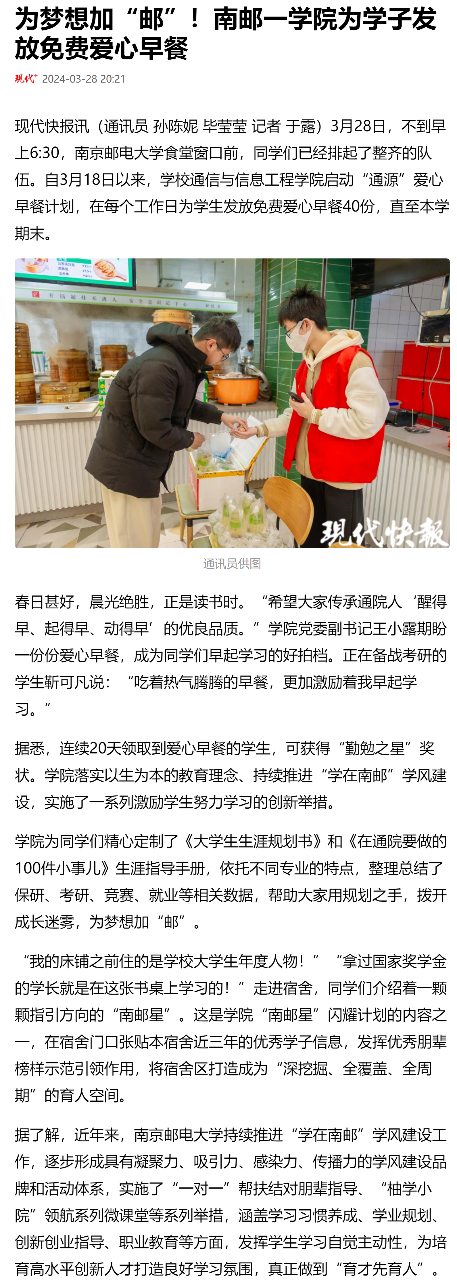 【现代快报全媒体】为梦想加“邮”!南邮一学院为学子发放免费爱心早餐
