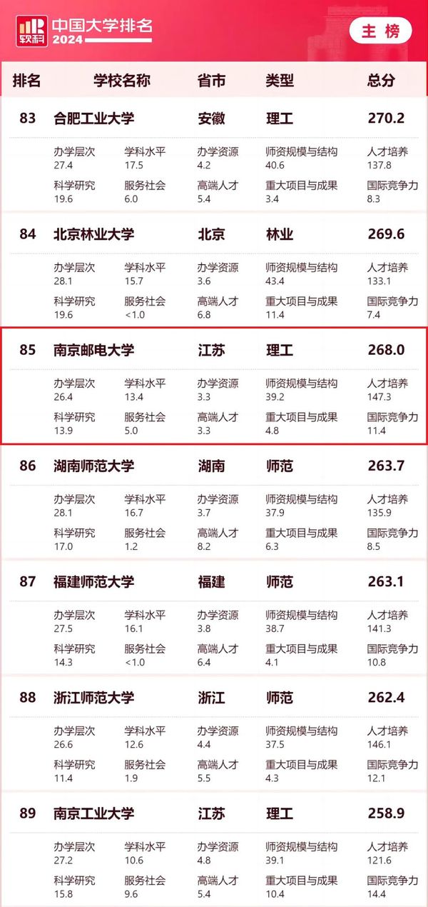4月18日,软科发布 “2024软科中国大学排名”,南京邮电大学位列主榜第85名,理工类高校第35名,保持稳步前进态势。