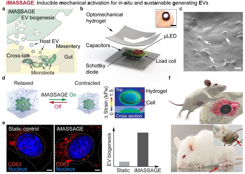 针对以上难题,团队从细胞生物信息学角度出发,发展了一种无线生物电子学技术,通过给予细胞力学信号刺激,控制目的细胞大量生产外泌体(称之为细胞按摩技术-iMASSAGE)。该技术的特点与优势是:与目前常规的通过扩大细胞培养量来实现外泌体获取量提升的方法相比,iMASSAGE技术无需通过增加细胞量,而是通过提升每个细胞的生产效率,来实现外泌体产量的提升;该技术使用无线生物电子器件,能够远程控制器件内的细胞生产外泌体,因此,可以进一步植入体内病变区,通过电子设备按需控制体内外泌体生产,满足潜在个体治疗的需求;基于体内病变区原位生产和释放治疗性外泌体的技术,可以避免常规静脉或系统给药导致的体液循环消耗和脱靶效应,增强局部有效治疗浓度;通过特定细胞的在体原位外泌体可控生产,该技术有可能为探索体内细胞与细胞、细胞与肠菌、肿瘤菌群间的跨物种生物信息交流提供工具。