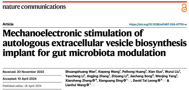 近日,化学与生命科学学院汪联辉教授、丁显光教授与新加坡国立大学合作,在合成生物学与无线生物电子领域取得进展,相关成果以“Mechanoelectronic stimulation of autologous extracellular vesicle biosynthesis implant for gut microbiota modulation”为题发表在国际学术期刊Nature Communications上。汪联辉教授、丁显光教授和NUS David Tai leong为共同通讯作者,青年教师万双双为论文第一作者,材料科学与工程学院杨文静教授给予大力支持。