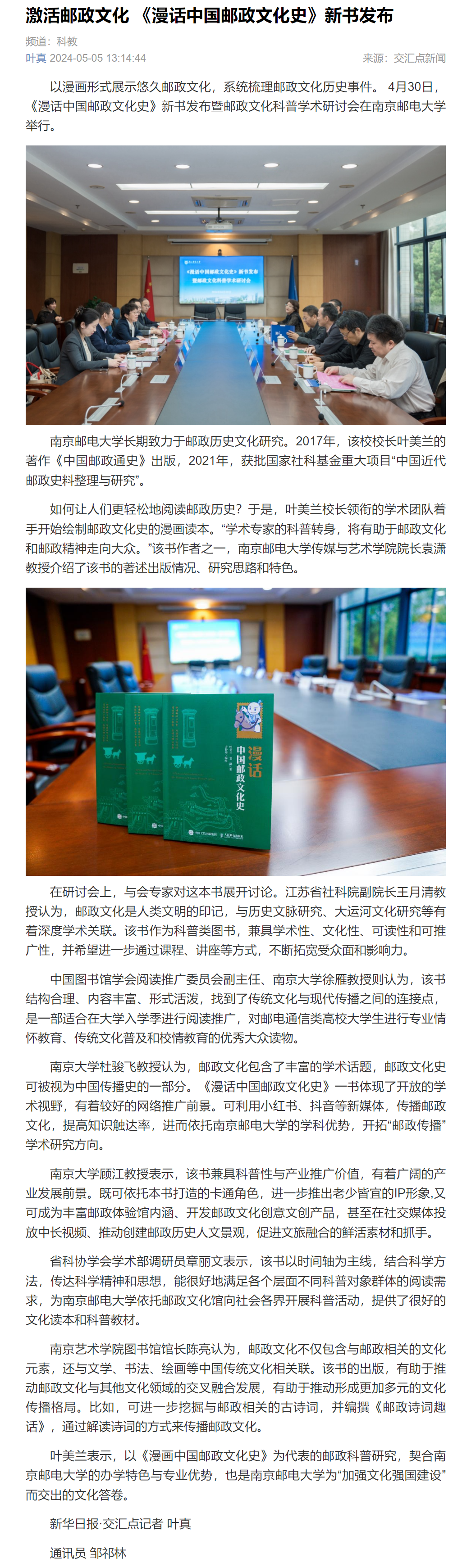 【新华日报客户端】激活邮政文化 《漫话中国邮政文化史》新书发布
