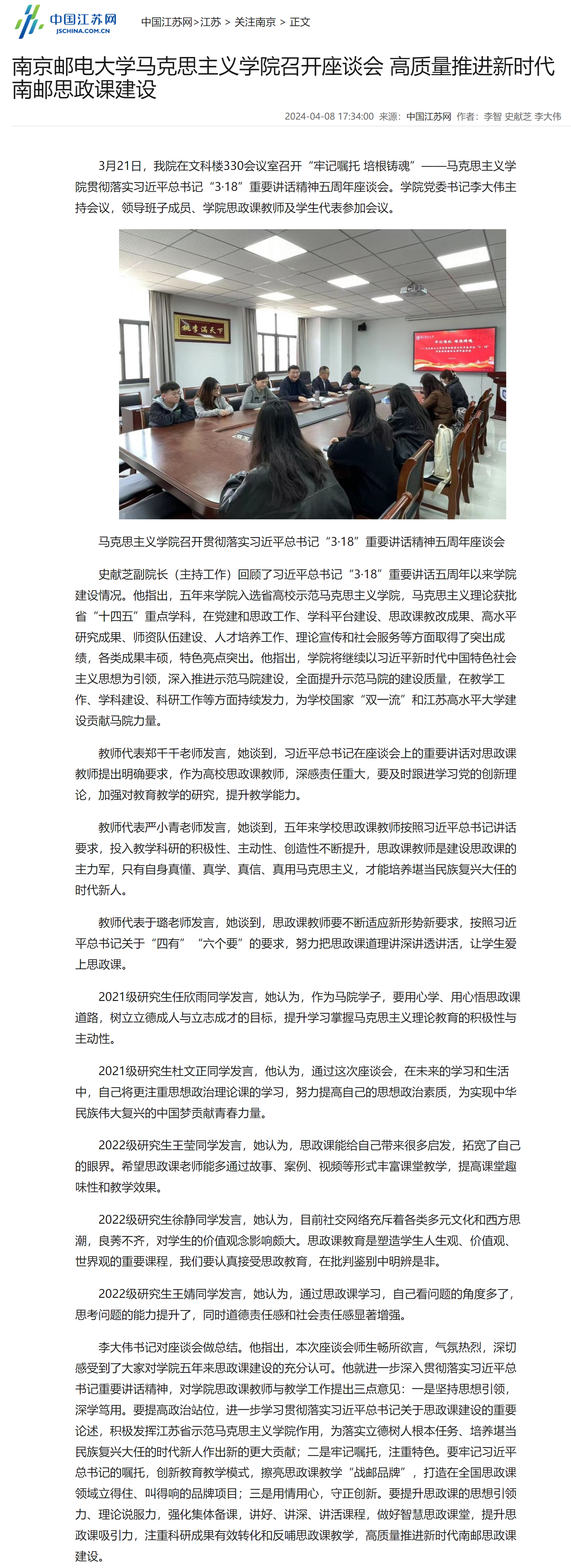 【中国江苏网】南京邮电大学马克思主义学院召开座谈会 高质量推进新时代南邮思政课建设