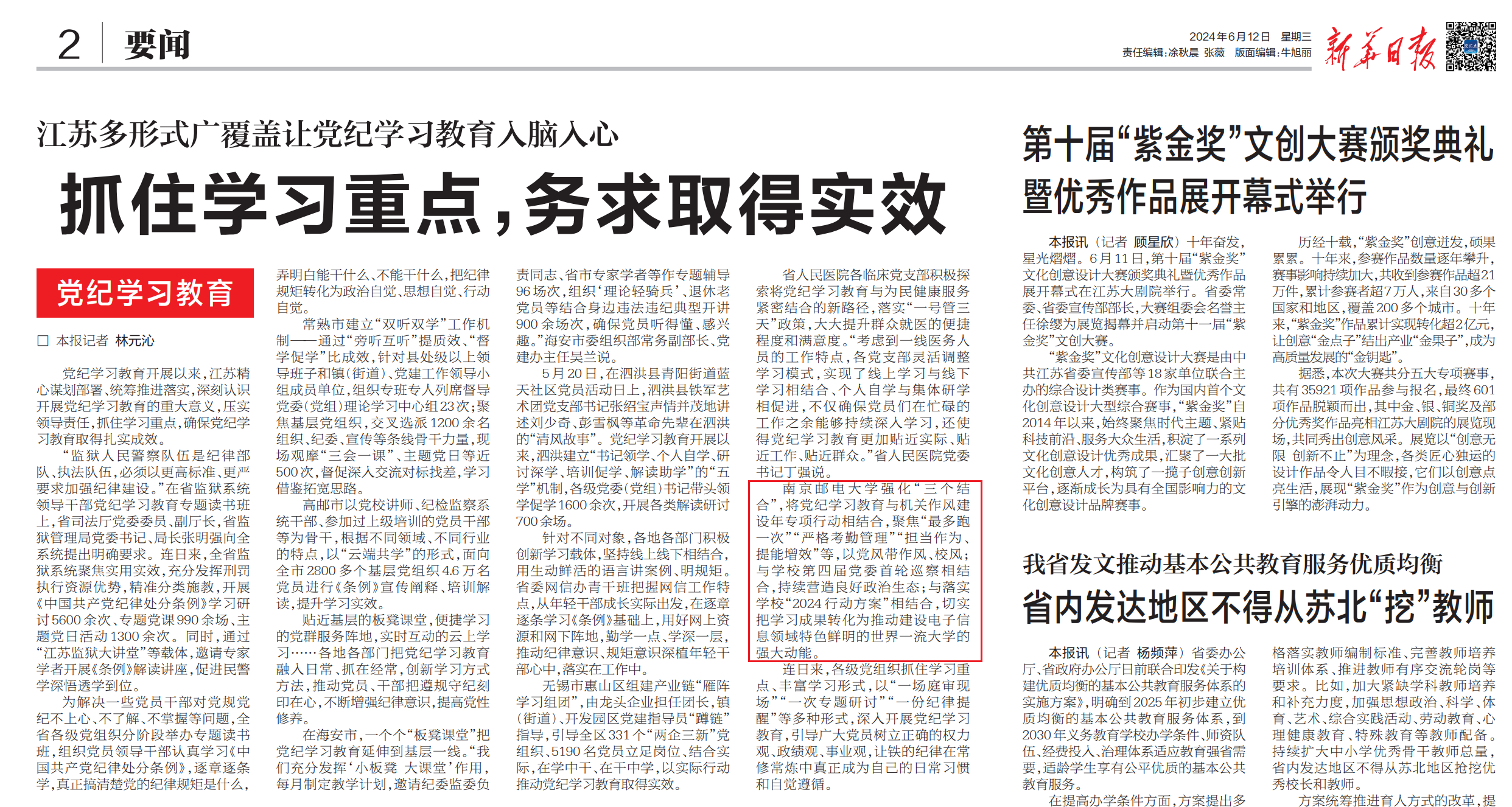 南京邮电大学强化“三个结合”,将党纪学习教育与机关作风建设年专项行动相结合,聚焦“最多跑一次”“严格考勤管理”“担当作为、提能增效”等,以党风带作风、校风;与学校第四届党委首轮巡察相结合,持续营造良好政治生态;与落实学校“2024行动方案”相结合,切实把学习成果转化为推动建设电子信息领域特色鲜明的世界一流大学的强大动能。