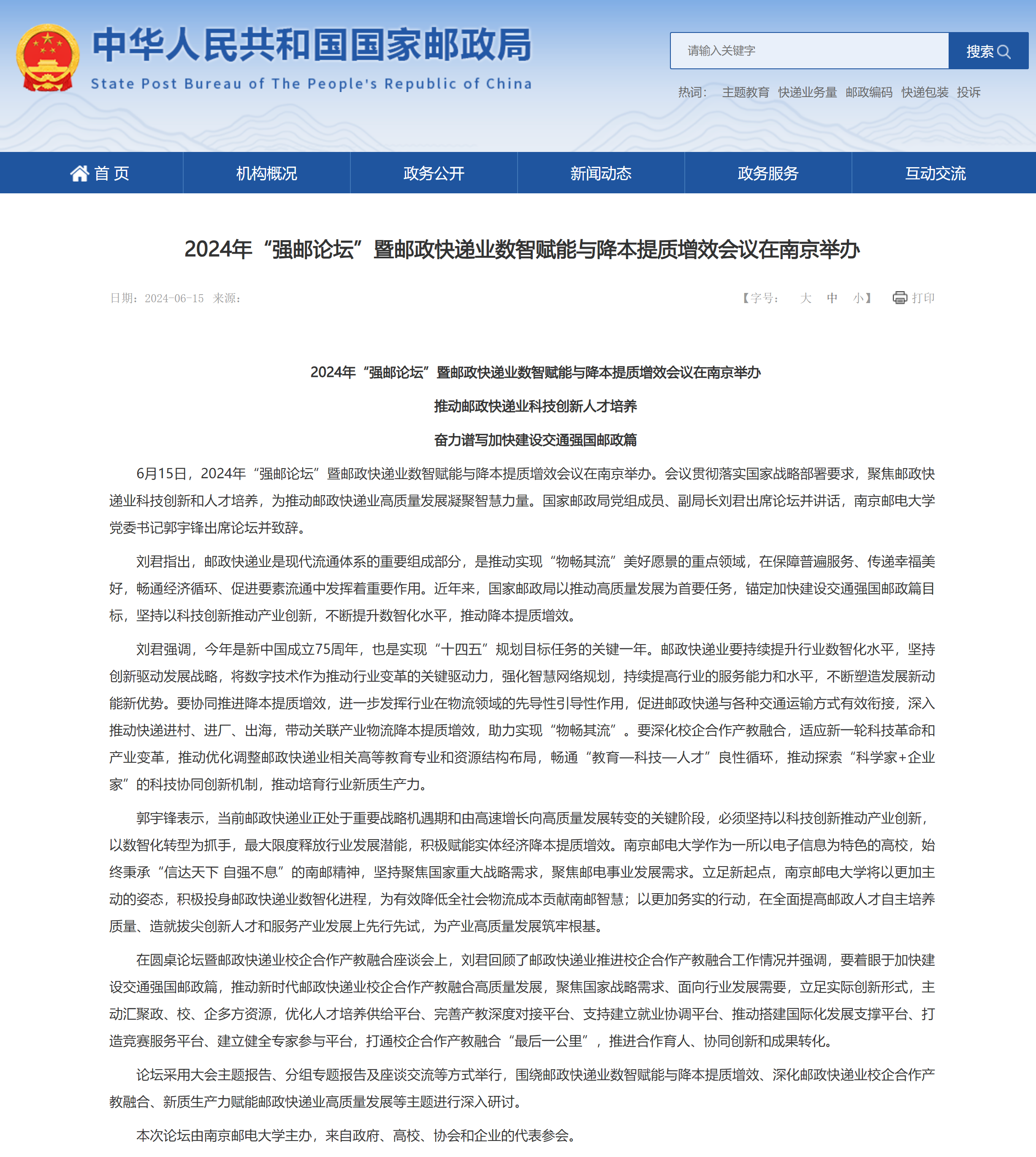 【国家邮政局官网】2024年“强邮论坛”暨邮政快递业数智赋能与降本提质增效会议在南京举办