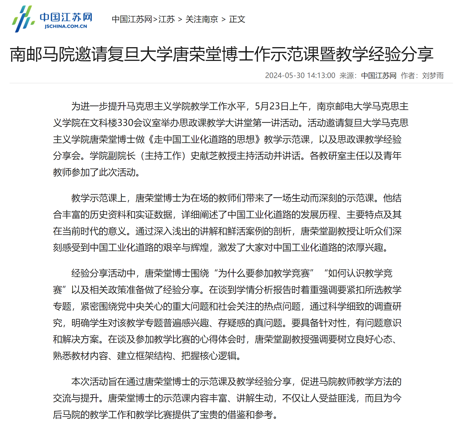 【中国江苏网】南邮马院邀请复旦大学唐荣堂博士作示范课暨教学经验分享