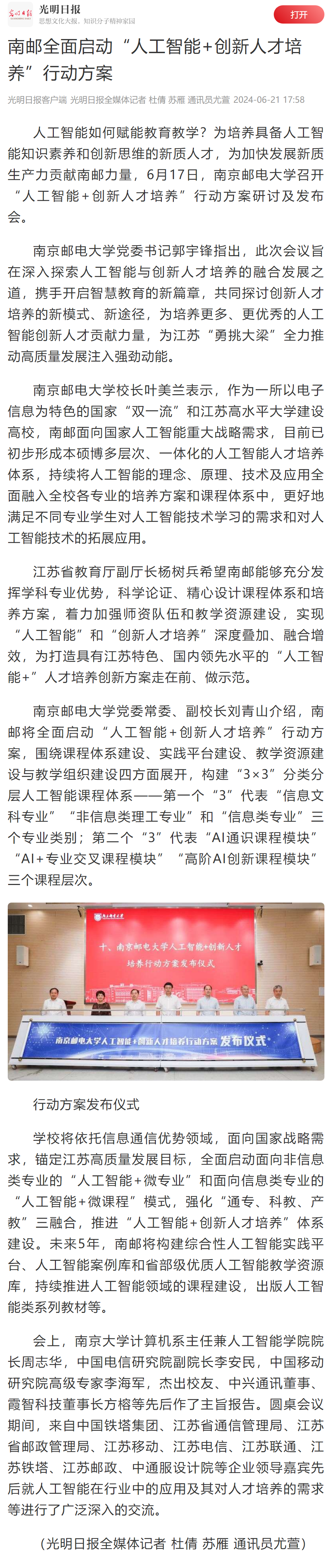 【光明日报客户端】南邮全面启动“人工智能+创新人才培养”行动方案
