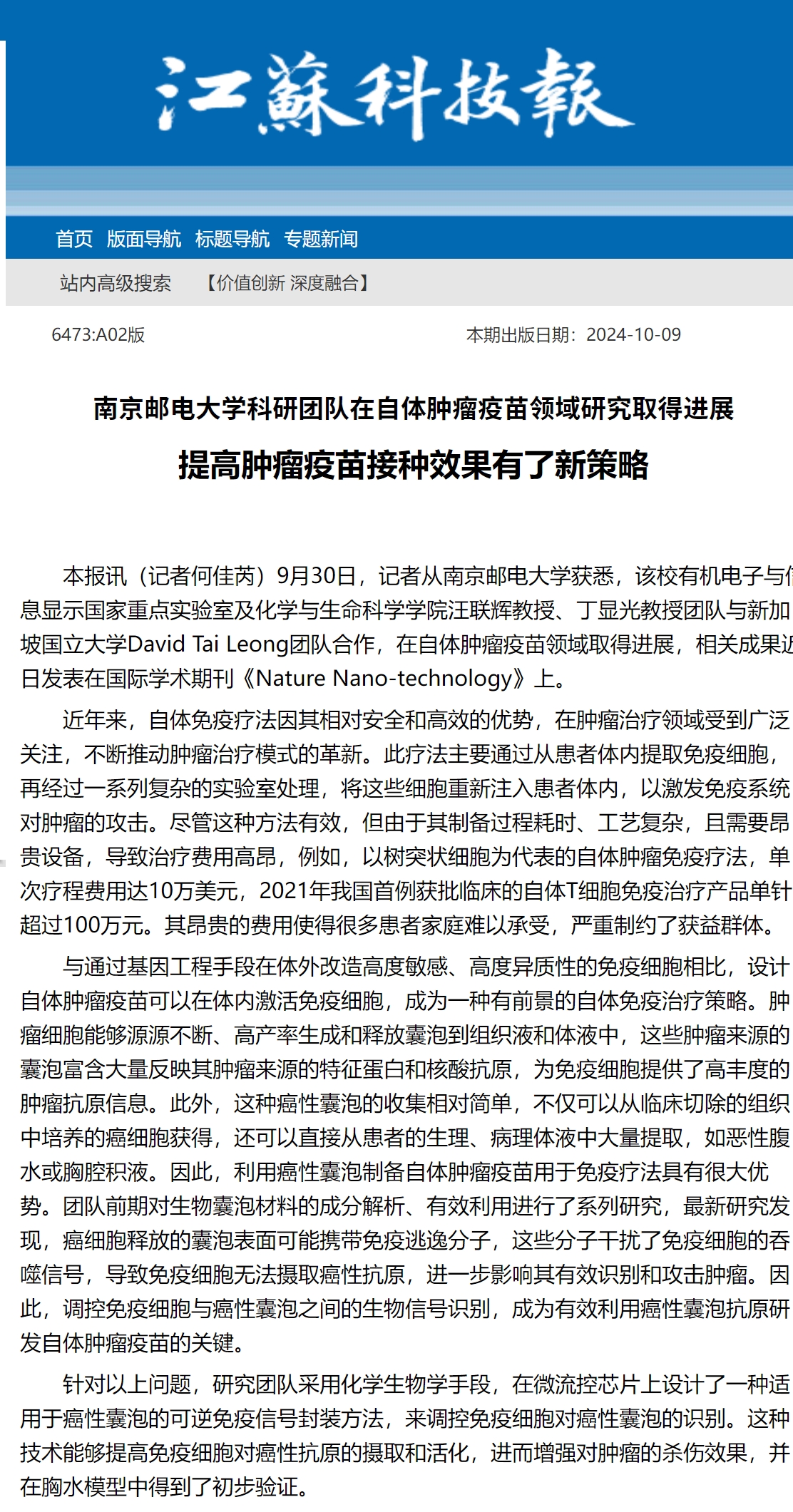 【江苏科技报】南京邮电大学科研团队在自体肿瘤疫苗领域研究取得进展 提高肿瘤疫苗接种效果有了新策略
