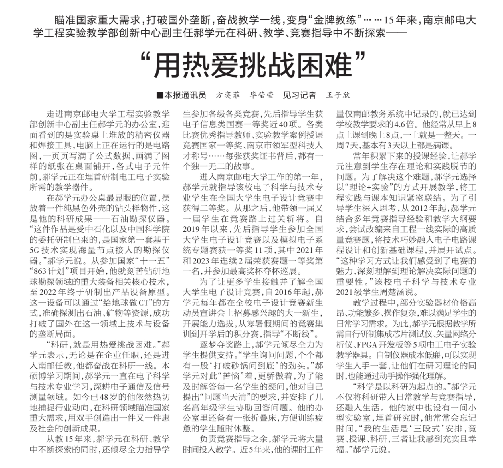 【江苏教育报】南京邮电大学工程实验教学部创新中心副主任郝学元在科研、教学、竞赛指导中不断探索——“用热爱挑战困难”