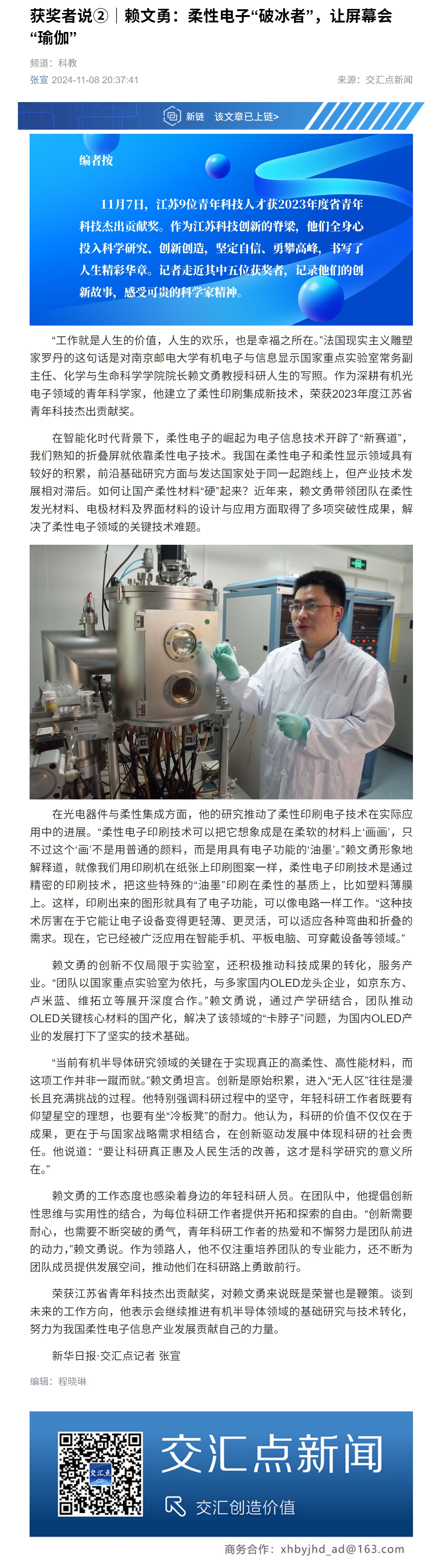 【新华日报客户端】赖文勇:柔性电子“破冰者”,让屏幕会“瑜伽”