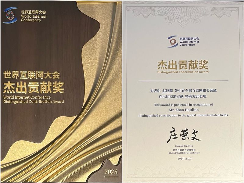 “世界互联网大会杰出贡献奖”旨在表彰在全球互联网相关领域作出杰出贡献的个人和企业,在2024年世界互联网大会乌镇峰会首次颁发。赵厚麟校友一直“与ITU各界成员携手促进信息通信产业创新、普惠发展,共绘全球信息通信新蓝图”,荣获“世界互联网大会杰出贡献奖”个人方向奖项。据悉,今年共有7位个人获得该奖项。