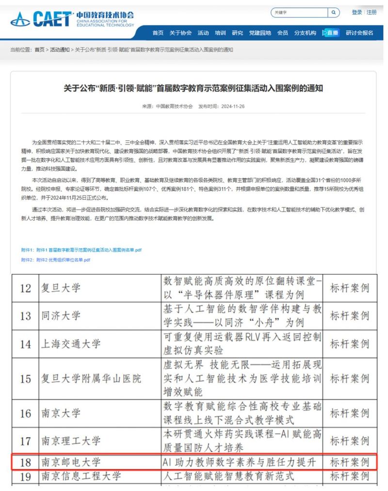 11月26日,由中国教育技术协会组织开展的“‘新质·引领·赋能’首届数字教育示范案例征集活动”入围案例名单正式公布,南邮申报的《AI助力教师数字素养与胜任力提升》入围标杆案例。