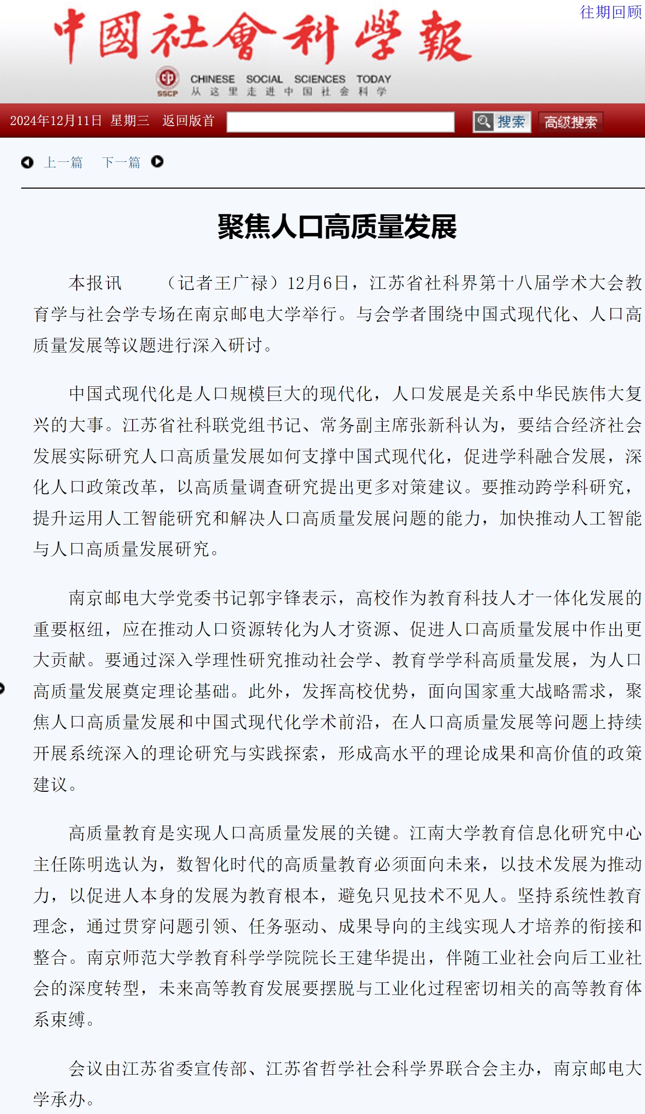 【中国社会科学报】江苏省社科界第十八届学术大会教育学与社会学专场聚焦人口高质量发展
