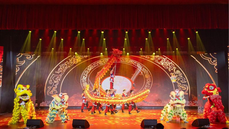 新年晚会以铿锵昂扬的新派龙狮秀《龙腾华夏》开场,气势磅礴的交响乐《激情燃烧的岁月》激发了学子的家国情怀,原创朗诵《这是一张怎样的脸》歌颂了校友徐六保将青春与热血奉献给祖国边防事业的感人事迹,原创合唱《青春燃烧的火种》等作品展现了学子们青春似火的蓬勃力量,舞蹈《石榴花开》勾勒出56个民族像石榴籽般凝心聚力、团结友爱的美好画卷,摇滚乐队带来的《像梦一样自由》等歌曲展现了青年们在充满诗意与自由的狂野中努力奔跑的模样。