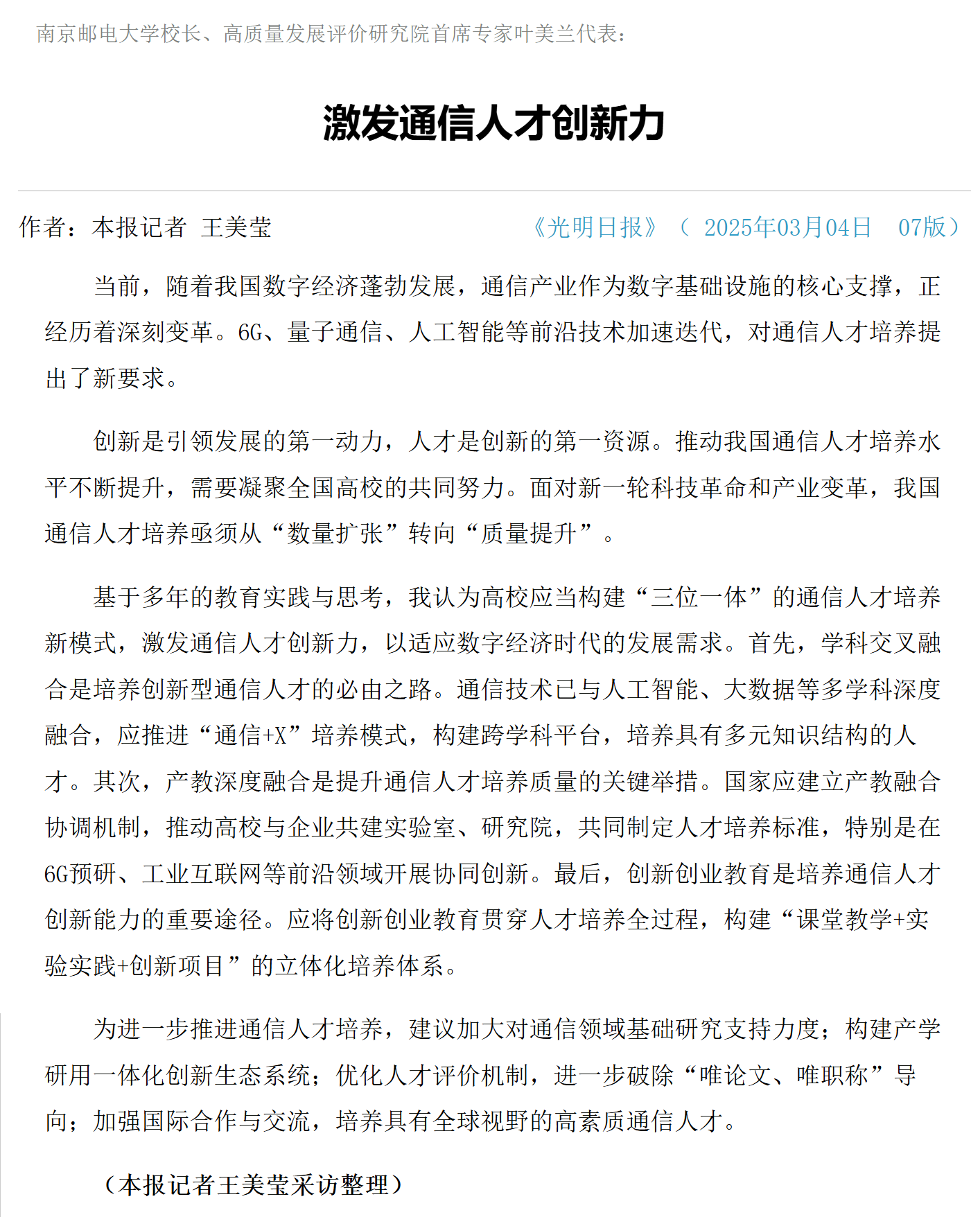 【光明日报】南京邮电大学校长、高质量发展评价研究院首席专家叶美兰代表:激发通信人才创新力