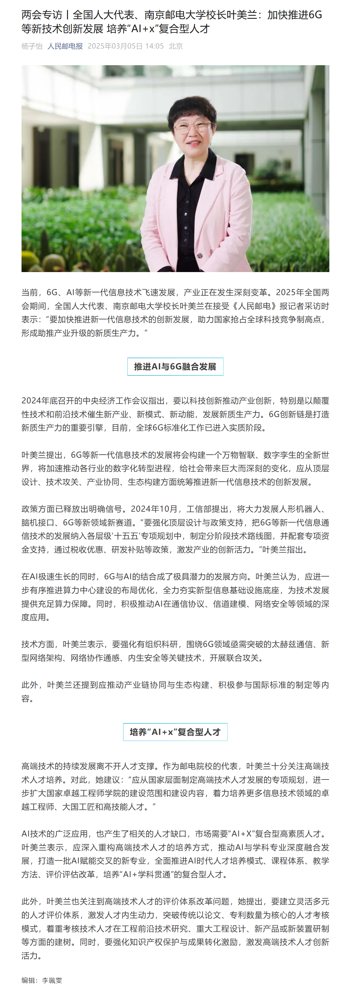 【人民邮电报】两会专访丨全国人大代表、南京邮电大学校长叶美兰:加快推进6G等新技术创新发展 培养“AI+x”复合型人才