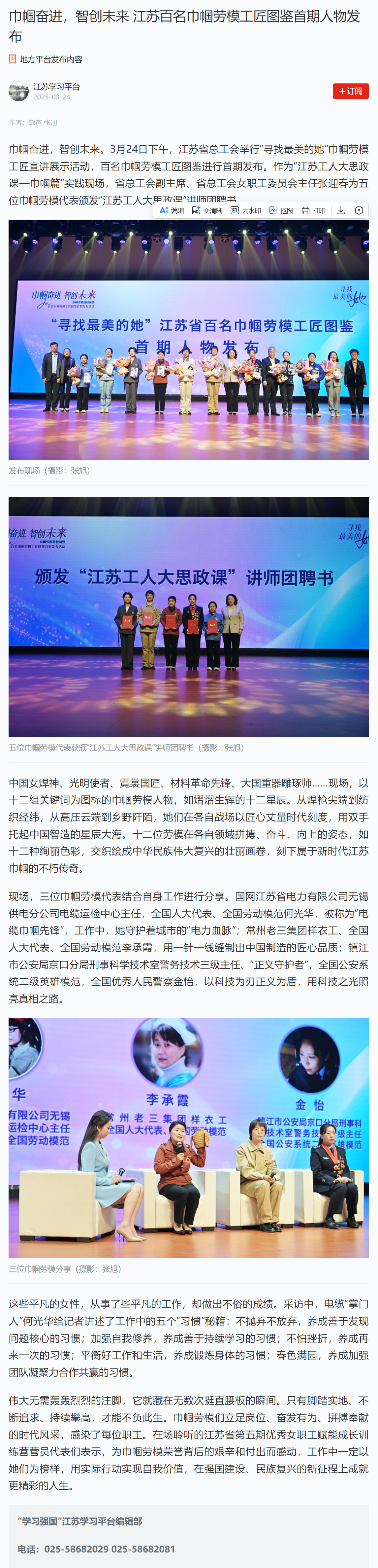【学习强国】巾帼奋进,智创未来 江苏百名巾帼劳模工匠图鉴首期人物发布