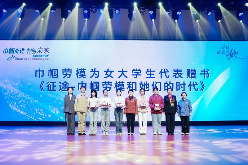 何光华等五位巾帼劳模为我校女大学生代表赠送书籍《征途——巾帼劳模和她们的时代》。
