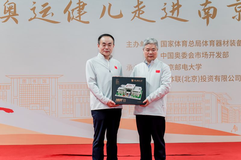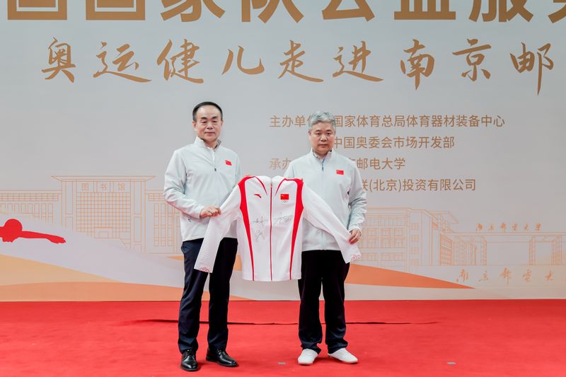 于建勇主任、郭宇锋书记、李金泉主任为奥运冠军杨倩、张雨霏、王赐月等健儿们颁发荣誉证书,表彰他们为体育事业作出的杰出贡献。于建勇主任向南京邮电大学赠送巴黎奥运会领奖服,郭宇锋书记回赠学校模型。