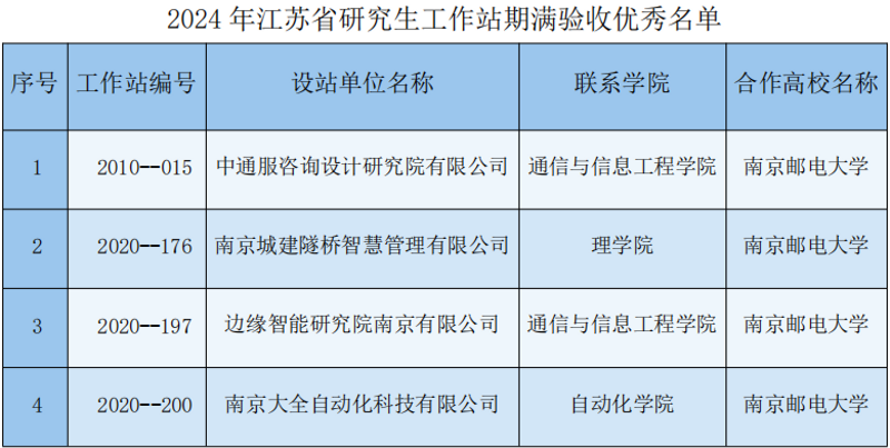 3月28日,江苏省教育厅、省科技厅联合公布“2024年江苏省研究生工作站期满验收结果”,南京邮电大学参与考核的研究生工作站全部顺利通过。其中,中通服咨询设计研究院有限公司、南京城建隧桥智慧管理有限公司、边缘智能研究院南京有限公司和南京大全自动化科技有限公司等4家研究生工作站获评“江苏省优秀研究生工作站”。