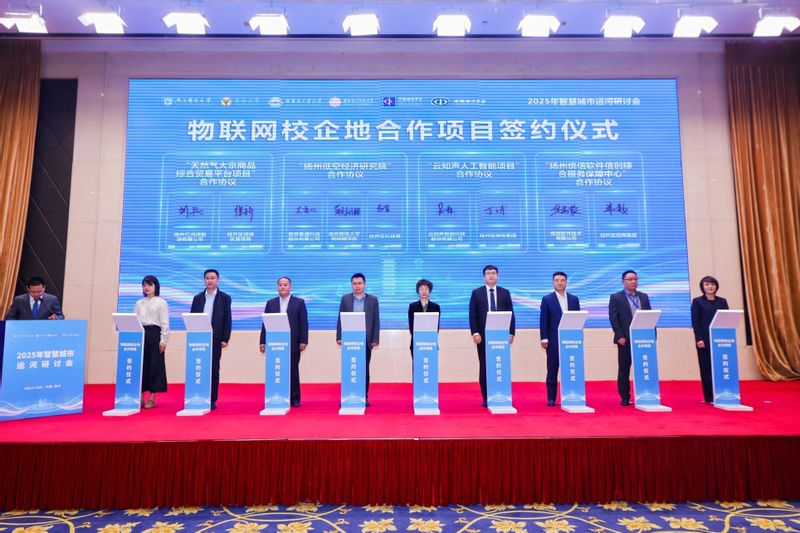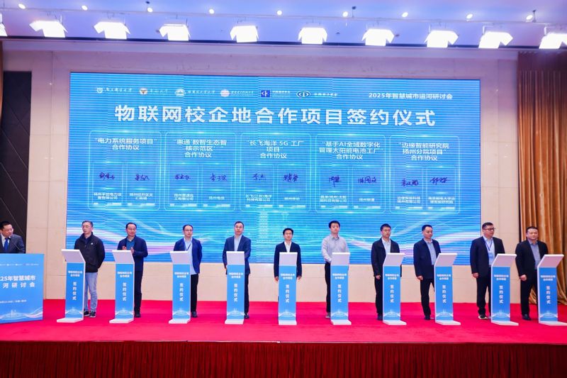开幕式上举行了“物联网校企地合作项目签约仪式”。扬州经济技术开发区作为扬州科技创新的核心引擎,现场签约了9个重点项目,涵盖人工智能、低空经济、5G工厂、数字化管理等前沿领域。