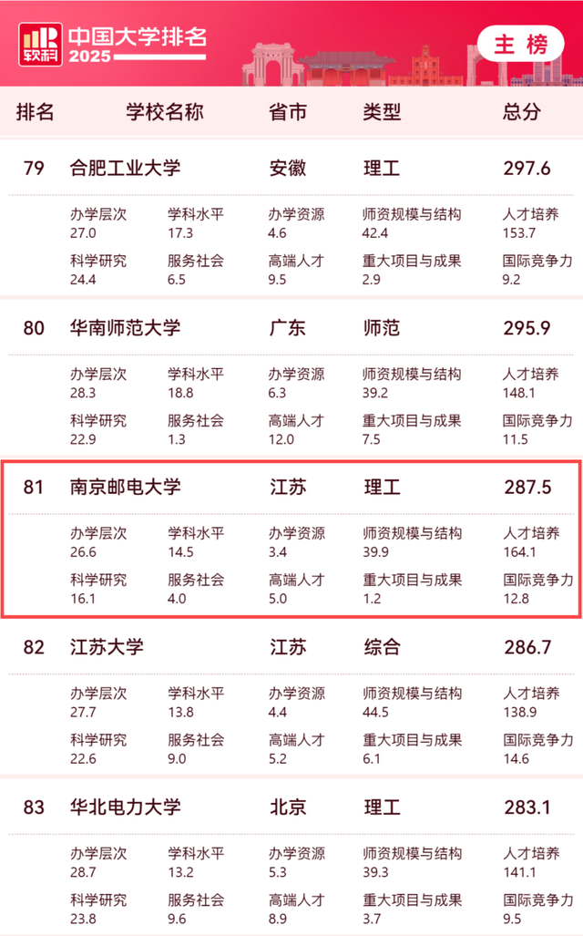 4月15日,高等教育专业评价机构软科发布“2025软科中国大学排名”,南京邮电大学位列主榜全国第81名,实现“十四五”期间持续进步,较2024年前进4名。在2025软科中国理工类大学排名位列全国第34名。
