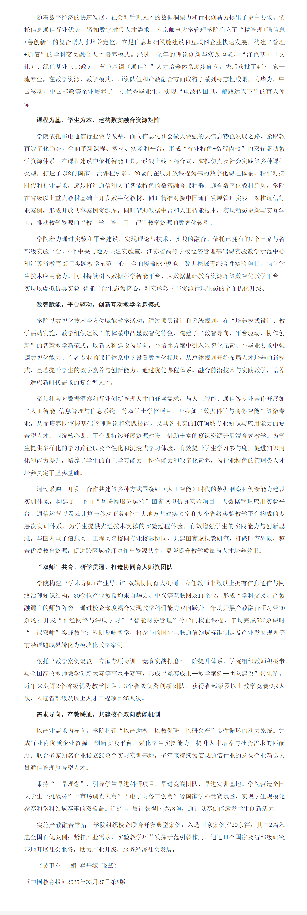 【中国教育报】南京邮电大学管理学院产教融合促发展 数智赋能育英才
