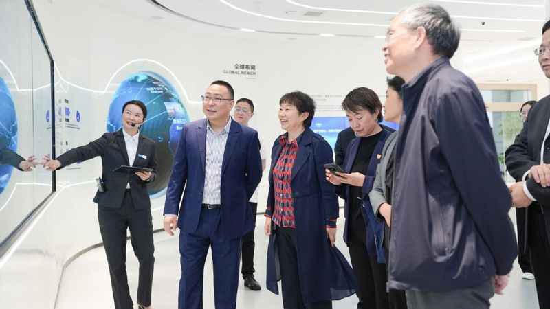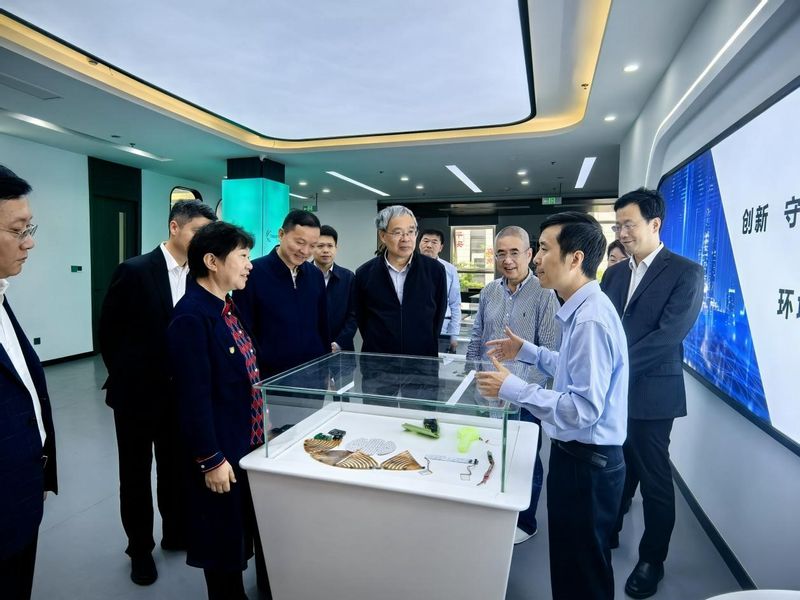 在中天科技集团总裁薛驰和中天科技集团总工程师、研究院院长、数字产业总裁谢书鸿的陪同下,叶美兰校长一行参观了中天科技集团展厅,系统了解企业发展历程、核心技术成果及未来产业规划。