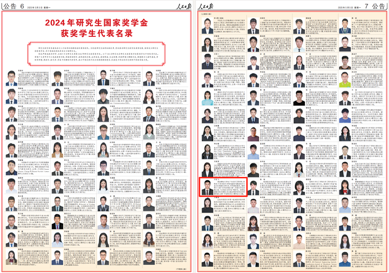 5月5日,《人民日报》公布2024年研究生国家奖学金获奖学生代表名录,南京邮电大学电子与光学工程学院、柔性电子(未来技术)学院2022级电磁场与微波技术专业硕士研究生万宝飞作为江苏省属高校唯一获奖研究生代表入选,这也是学校研究生首次荣登该名录。