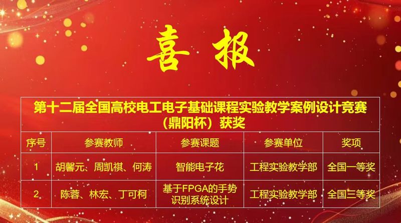 5月16日至18日,第十二届全国高校电工电子基础课程实验教学案例设计竞赛在哈尔滨举行。经过华东赛区初选、全国复赛的激烈角逐,南京邮电大学工程实验教学部胡馨元团队“智能电子花”实验教学案例、陈蓉团队“基于FPGA的手势识别系统设计”实验教学案例在综合评比中表现优异,分获全国一等奖、三等奖,展现了学校在电工电子实验教学领域的创新实力与教学水平。