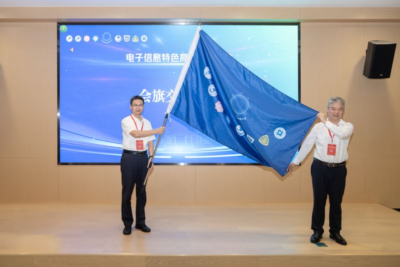 会上举行了电子信息特色高校发展大会会旗交接仪式。吴卿从郭宇锋手中接过会旗,杭州电子科技大学正式成为下一届电子信息特色高校发展大会主办单位。