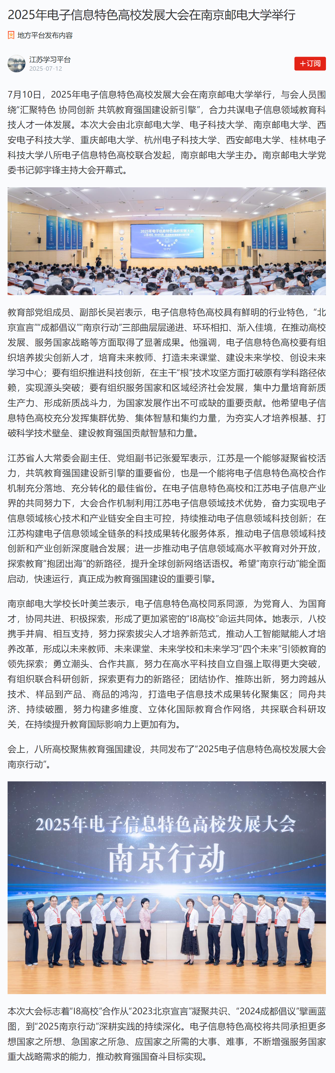 【学习强国】2025年电子信息特色高校发展大会在南京邮电大学举行